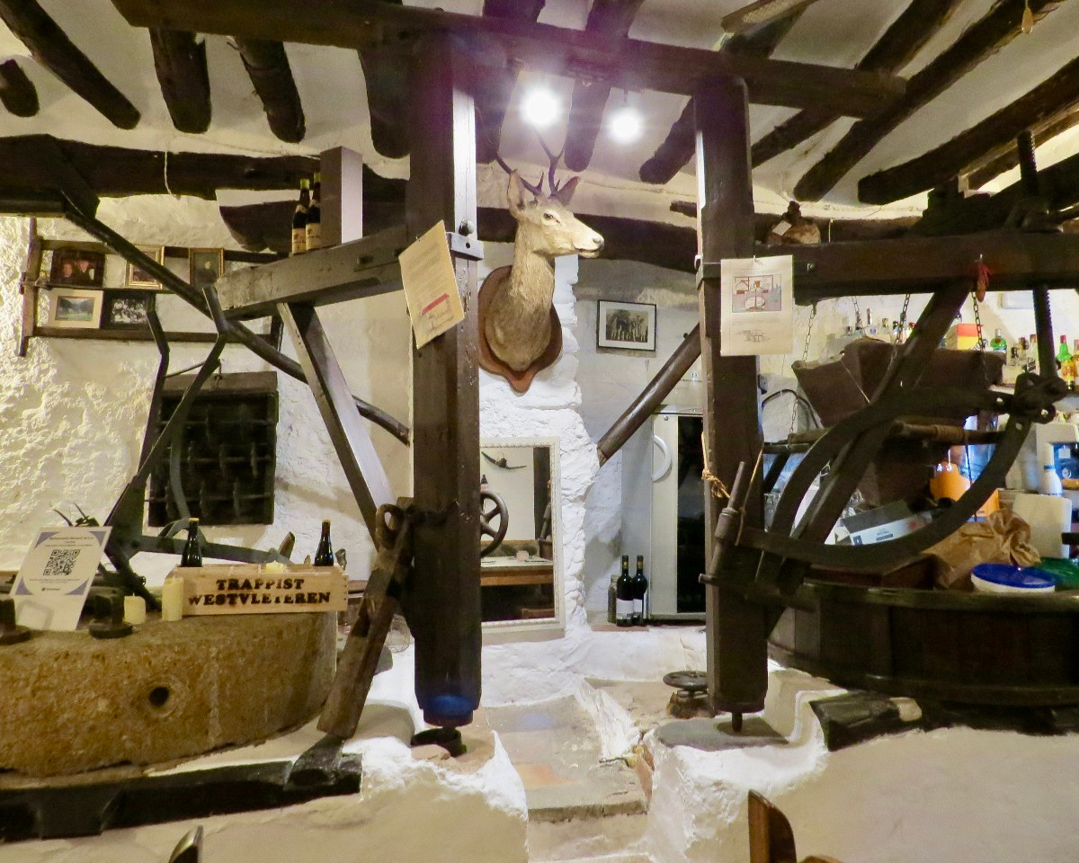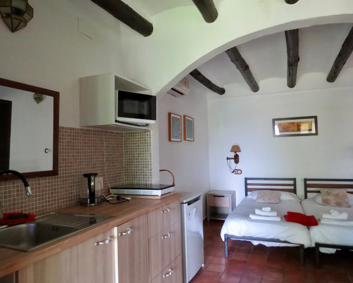 The interiors combine original stone walls, wooden beams, and rustic flooring with modern comforts, creating a character-filled yet functional hospitality setting.