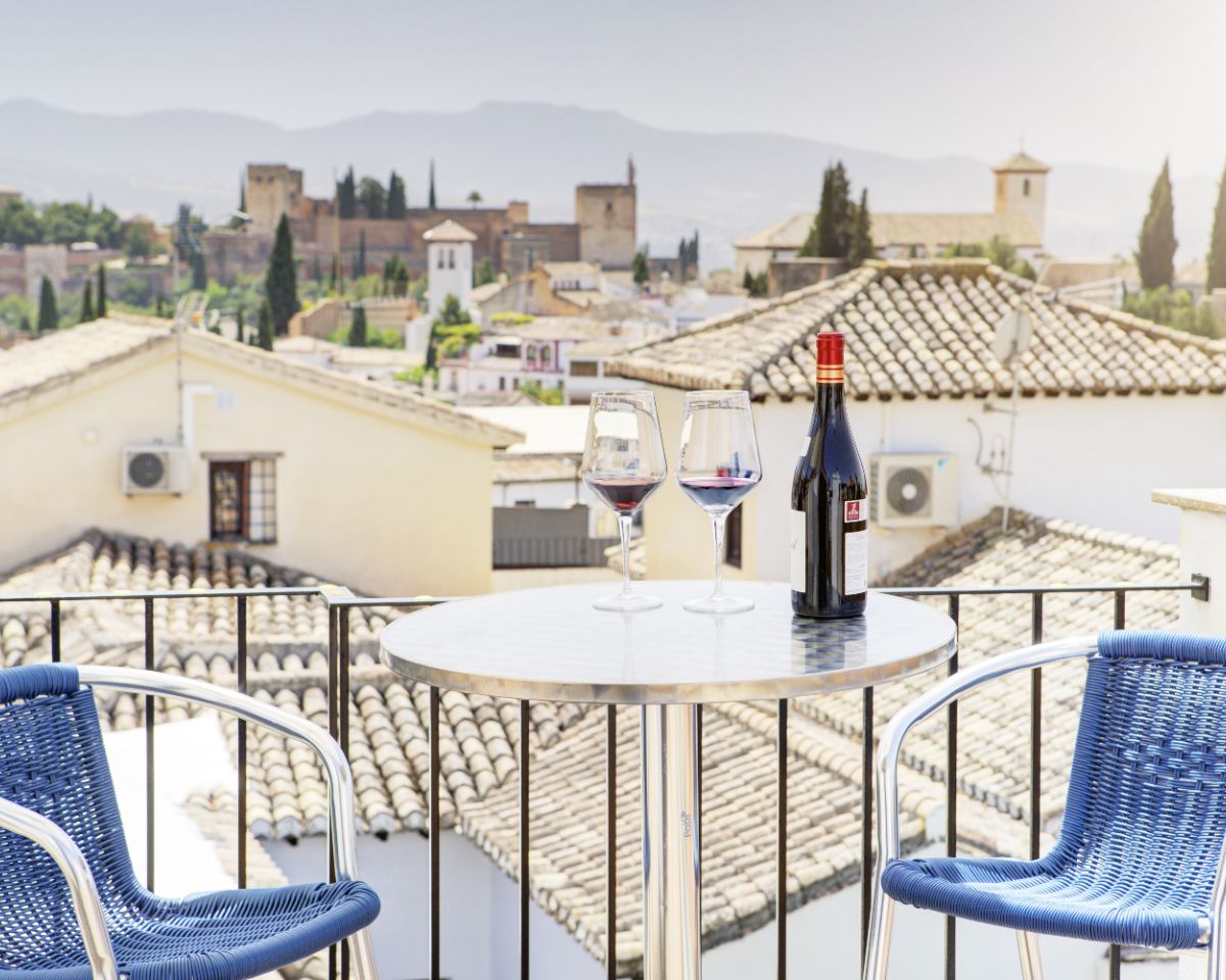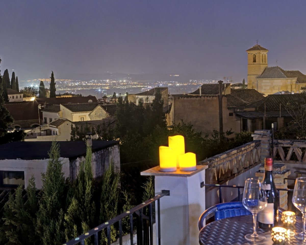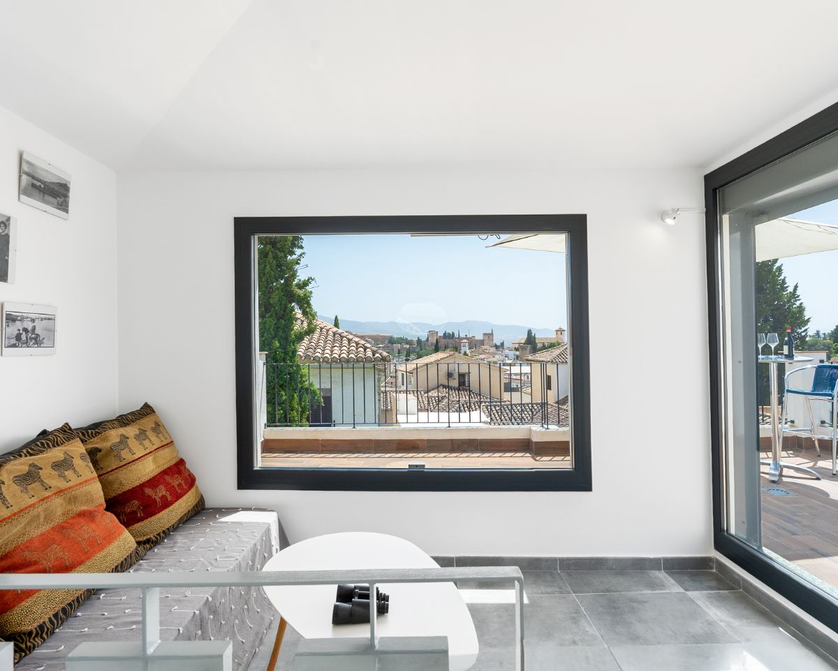 At the top of the property, a spectacular panoramic terrace functions as a true viewpoint, offering direct and uninterrupted views of the Alhambra and across the rooftops of the Albaicín.
