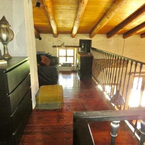 Main House: Double-height, open lounge, kitchen, and dining area with open fireplace and access to the outdoor kitchen/dining area. Includes a wood-fired stove for central heating, a secondary lounge with a cozy reading nook and fireplace, a study, a bathroom, and a storeroom housing the laundry and modern lithium battery system. Upstairs features a minstrel's gallery, two double bedrooms, and a family bathroom.